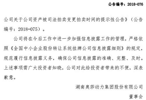 華聲在線11月9日訊 近日,湘籍新三板掛牌企業(yè)奧莎動力發(fā)布公告,公司9套房產(chǎn)將于11月10日至11日進(jìn)行司法拍賣,原因是公司陷入多起訴訟糾紛,無法償還債務(wù),被列為失信執(zhí)行人,公司資產(chǎn)被法院強(qiáng)制執(zhí)行進(jìn)行拍賣。