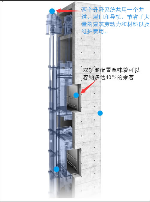 TWIN雙子電梯系統(tǒng)是目前市場上唯一的兩個轎廂獨(dú)立運(yùn)行于同一井道的電梯系統(tǒng),它解決了長期以來高層建筑的業(yè)主、施工人員和住戶在施工期和完工后的各種需求。一個轎廂在另一個上面,在一個軸上。 它為您提供相同的運(yùn)輸能力,減少25%的空間。 它還可以讓您在設(shè)置高性能的新標(biāo)準(zhǔn)的同時(shí)引入全新的流量概念。