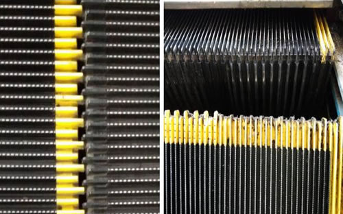 相鄰兩部扶梯,一側(cè)梳齒板嚙合過深,一側(cè)梳齒板嚙合過淺,