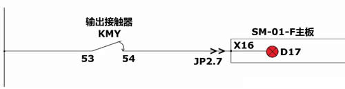為了驗(yàn)證故障點(diǎn)是否有誤,將電梯斷電復(fù)位重啟,在主板選層在電梯啟動(dòng)運(yùn)行前將KMY接觸器的常開點(diǎn)53、54摘掉一點(diǎn),然后按確認(rèn),當(dāng)運(yùn)行接觸器吸合時(shí)D17燈未點(diǎn)亮,隨后接觸器釋放同時(shí)輸入接觸器KMC釋放、主板報(bào)36號(hào)故障。接下來(lái)將此對(duì)常開點(diǎn)與相鄰的常開點(diǎn)臨時(shí)并接以確保電梯運(yùn)行,待更換。