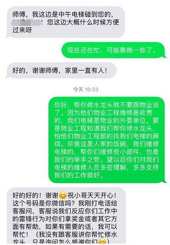 從對話里我們可以看出電梯維保人員在為電梯做保養(yǎng)或者維修工作,業(yè)主路過問能不能幫忙修水龍頭,電梯維保人員正巧有這方面的手藝就答應幫這位業(yè)主維修,不要回報,唯一的一點要求就是能對我們電梯維保人員多一點理解。