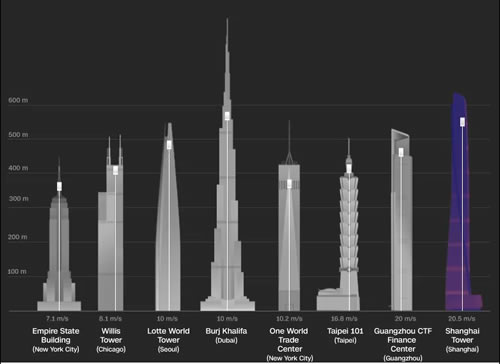 如今,世界上最快的電梯安裝在世界第二高樓 - 上海中心大廈。 它以每秒67英尺(或每小時(shí)46英里)的速度行進(jìn),并連續(xù)穿過1,898英尺的摩天大樓的2,073英尺。