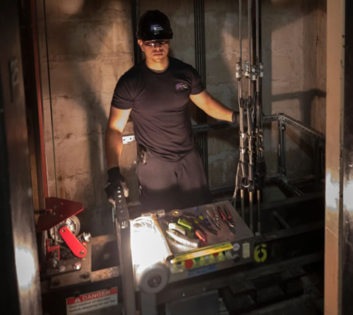 電梯維修人員站在電梯轎廂頂部