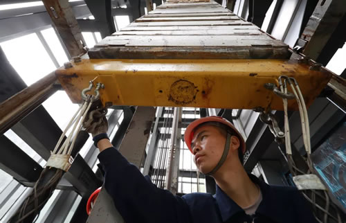 在井道里進行轎頂維保作業(yè)