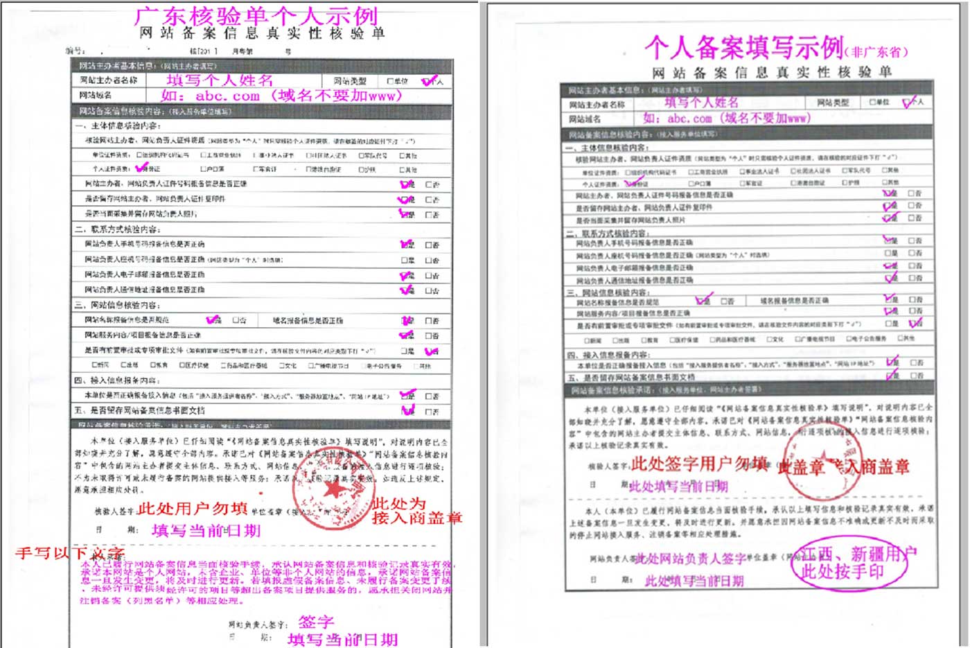 | 網(wǎng)站備案信息真實(shí)性核驗(yàn)單(個(gè)人) | 原件,簽名后并按上手印,只打印表格里面的內(nèi)容,說明內(nèi)容不用打印,必須一頁(yè)打印出來,分頁(yè)無效。注意:廣東省個(gè)人備案,請(qǐng)?jiān)诤蓑?yàn)單“網(wǎng)站負(fù)責(zé)人簽字”欄上方空白處黑色筆手抄:“本人已履行網(wǎng)站備案信息當(dāng)面核驗(yàn)手續(xù),承認(rèn)網(wǎng)站備案信息和核驗(yàn)記錄真實(shí)有效,承諾本網(wǎng)站是個(gè)人網(wǎng)站,未含企業(yè)、單位等非個(gè)人網(wǎng)站的信息,承諾網(wǎng)站備案信息一旦發(fā)生變更,將及時(shí)進(jìn)行更新,填報(bào)虛假備案信息、未履行備案變更手續(xù)、超出備案項(xiàng)目提供服務(wù)的,愿承擔(dān)關(guān)閉網(wǎng)站并注銷備案(列黑名單)等相應(yīng)處理?!?/span> | 1份 | 例圖 |