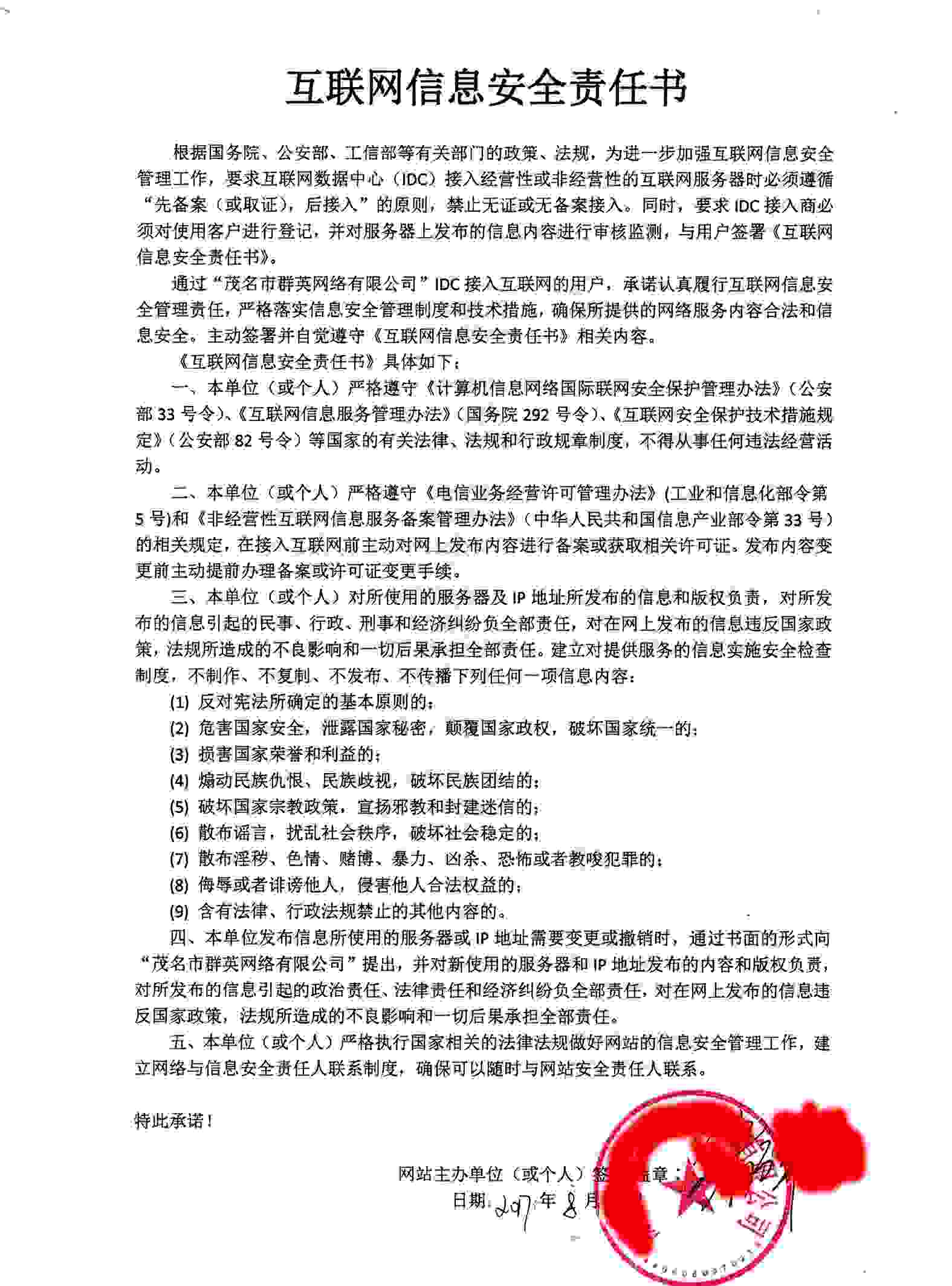 | 互聯(lián)網(wǎng)信息安全責(zé)任書 | 簽名后加蓋公章 | 1份 | 例圖 |