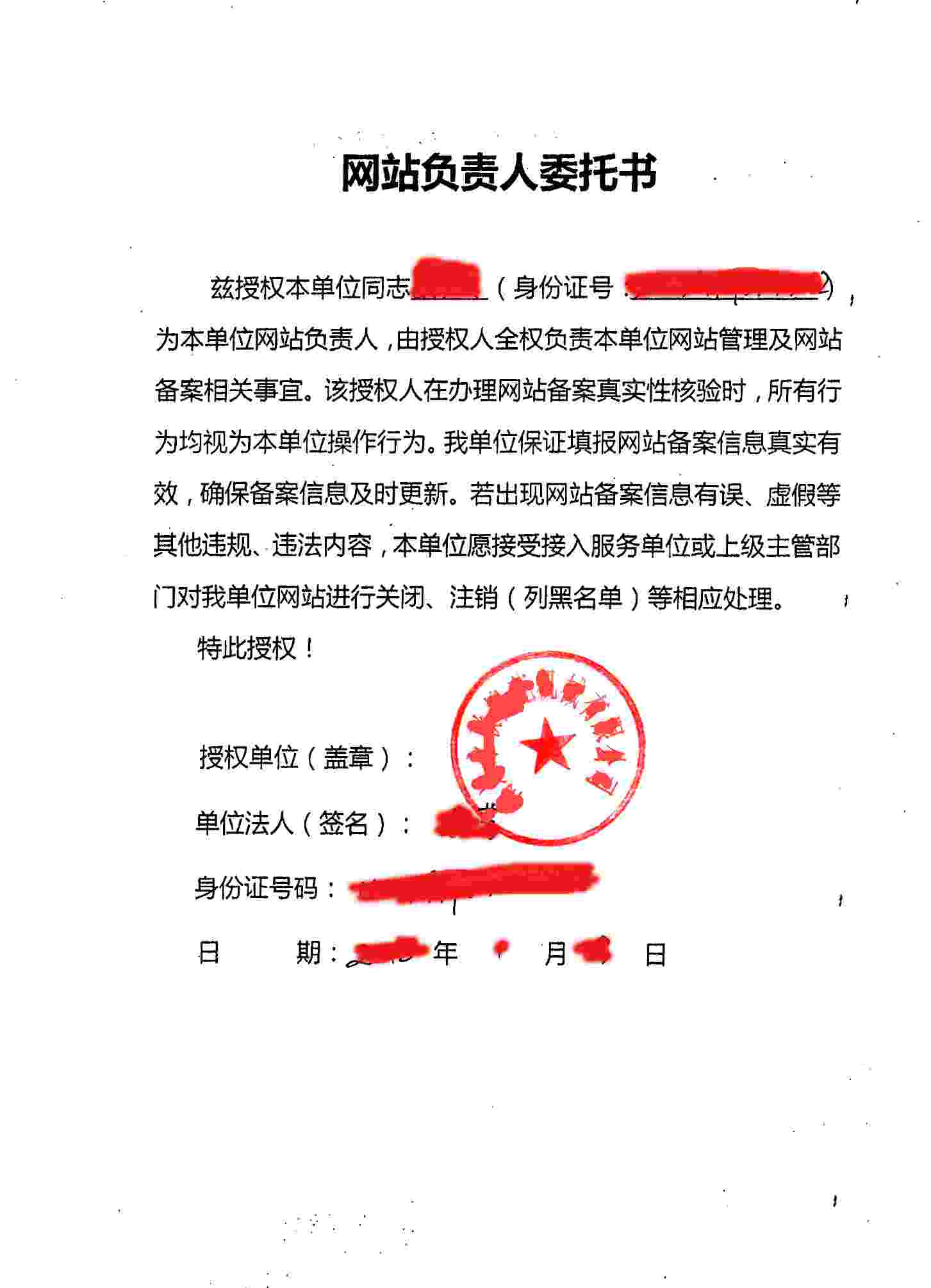 | 網(wǎng)站負(fù)責(zé)人委托書 | 如網(wǎng)站負(fù)責(zé)人不是法人需要提供網(wǎng)站負(fù)責(zé)人委托書 | 1份 | 例圖 |
